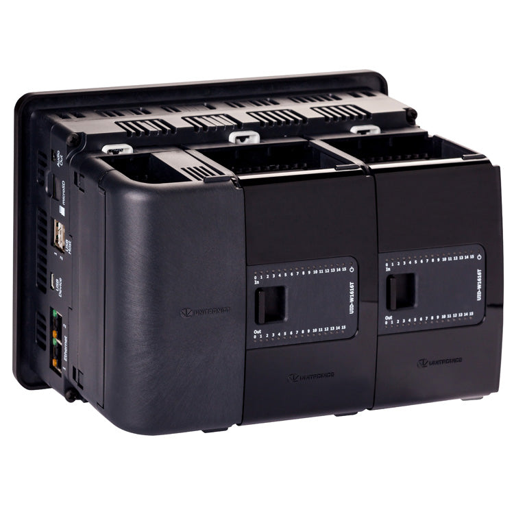 UniStream™ 7” Built-in dotykový LCD panel 800x480 (154.08 x 85.92mm), microSD, miniUSB, USB Host, Ethernet, 14 Digitálnych vstupov (2 HSC), 2 Analógové vstupy 0÷10V/0÷20mA 14 bit, 2 Pt/Ni/Termočlánky, 8 Reléových výstupov, 2 Analógové výstupy 0÷10V/-10÷10V/0÷20mA/4÷20mA 12 bit